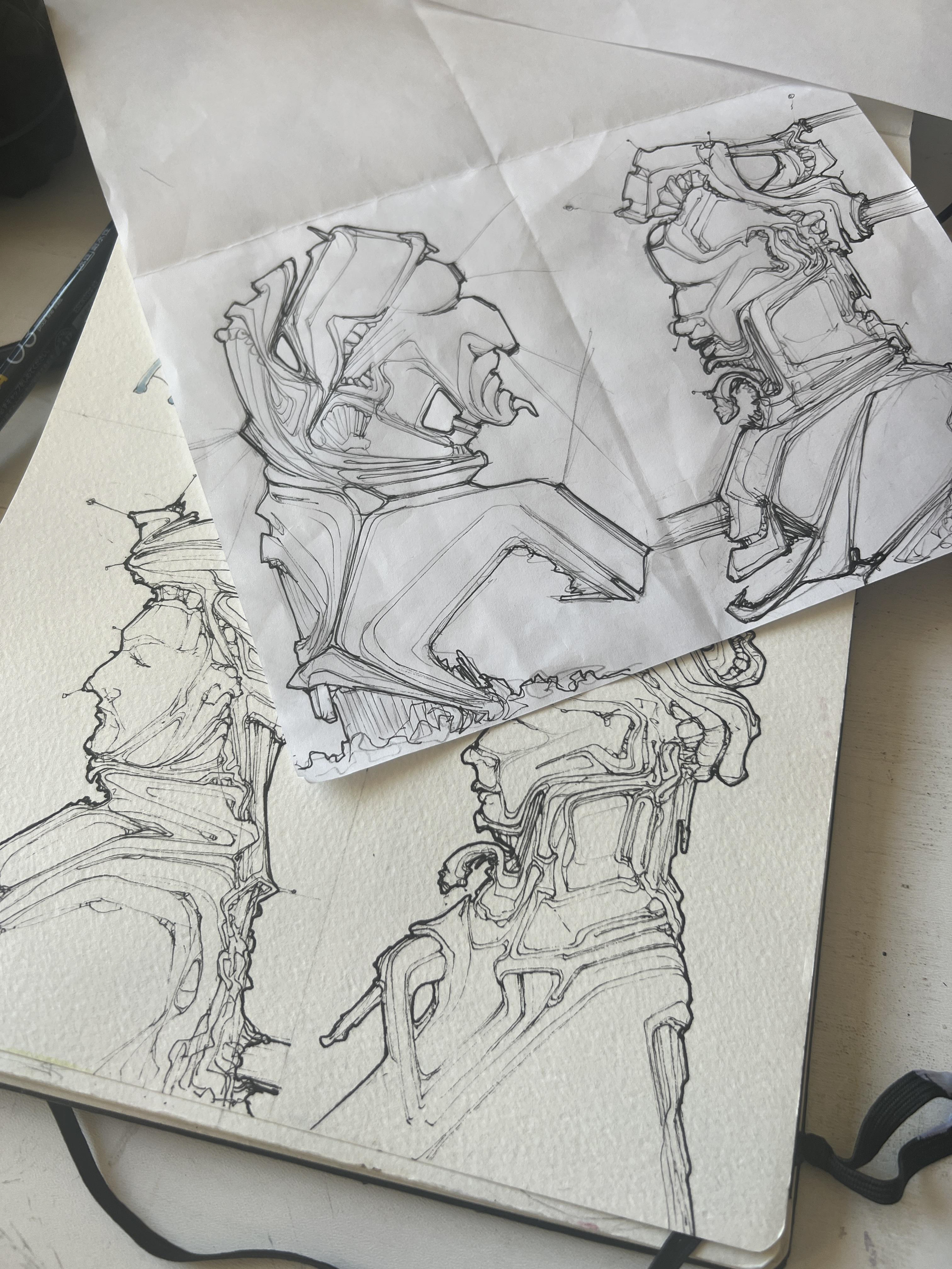 The motifs in these works flow naturally and freely from the imagination, just as the high viscosity paints flow into and around each other and the fluid tape lines dance over them. They are at once recognizable and fleeting, grotesque and beautiful, human and human-less. It is said that water carries the memories of our ancestors; let us carry the traces of turbulence not as wounds or faults, but as badges of honor and as timeless reminders of the beauty of our unfolding world.