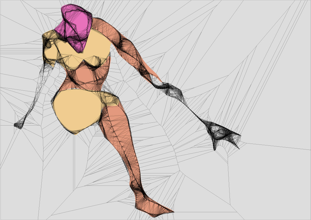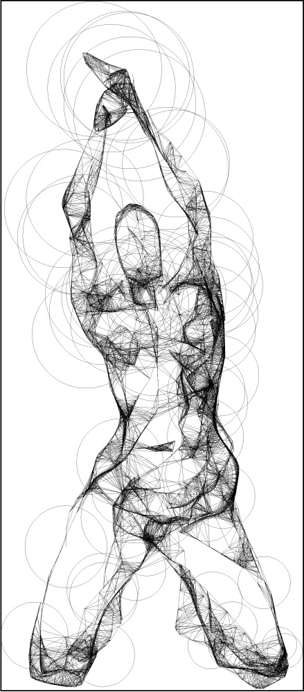For the TRANS | FIGURATE series, an ideal of female beauty is doubled on itself. Bringing into question contrasts of feminity/masculinity, XX/XY, beauty/mutation, control/chaos, organic/mechanic, and preparation/spontaneity, computer coding customized by the artist is executed to create a barrage of disparate elements. A manual > digital > analog > manual process started with drawing live in the computer at figure drawing sessions in New York, London, and Tokyo, and was realized through screenprinting and laser engraving to complete each pair.